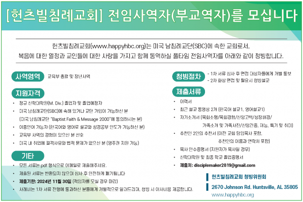 [헌츠빌침례교회] 전임사역자(부교역자)를 모십니다.