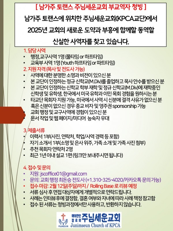 2025년 교회의 새로운 도약과 부흥에 함께할 동역할 신실한 사역자를 찾고 있습니다.