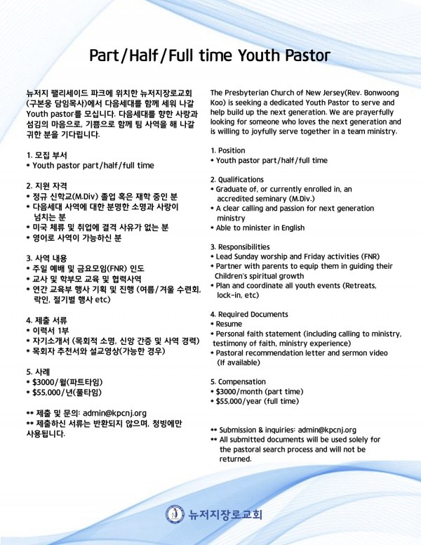 [NJ] Youth Group 사역자를 모십니다.