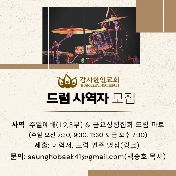 [CA] 감사한인교회에서 드럼 사역자를 모십니다.