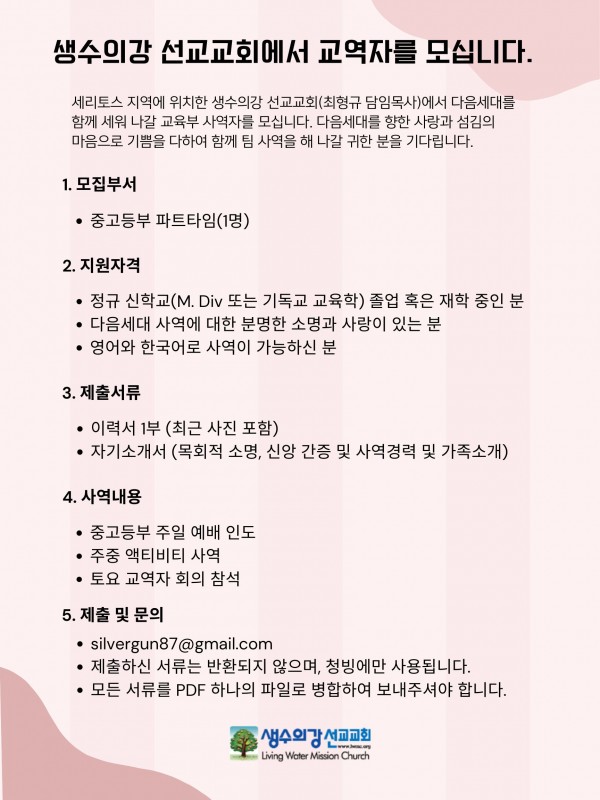 [CA] 생수의강 선교교회 Youth(part-time) 사역자 구인 페이지 정보 작성자 생수의강1 쪽지보내기 메일보내기 자기소개 아이디로 검색 전체게시물 쪽지보내기 메일보내기 자기소개 아이디로 검색 전체게시물 | 작성일2026-03-10 | 조회조회수 : 64회 목록 본문 이전글키보드 반주자를 모십니다.(부에나팍 소재) 26.03.12 다음글성가대 지휘자 청빙 26.03.09