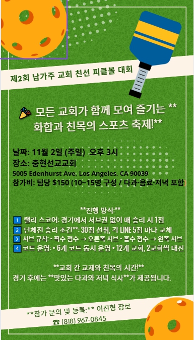 제2회 남가주 교회 연합 친선 피클볼 대회가 11월2일 있습니다.