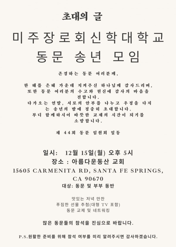 2025년 한 해를 은혜 가운데 마무리하며, 제 44대 동문 임원회가 준비한 송년모임에 귀하를 정중히 초대합니다.
