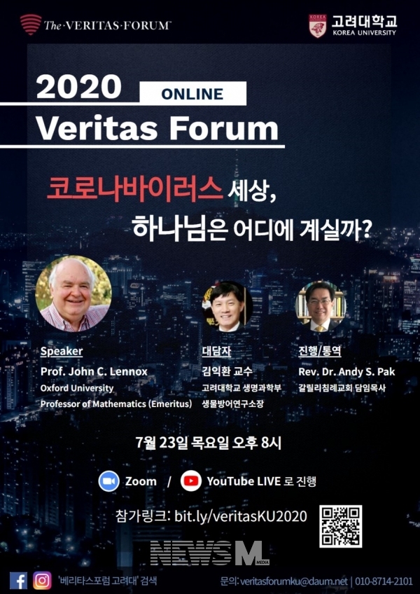 [뉴스M=황재혁 기자] 오는 23일 오후 8시에 [2020 베리타스포럼 고려대](이하 베리타스포럼)가 온라인으로 진행된다. 베리타스포럼은 기독교 최고의 지성들을 초청하여 강연과 토론을 진행하는 행사로, 포스트 모더니즘 이후 과학주의, 개인주의, 인본주의에 심취되고 있는 21세기 젊은이들에게 하나님의 진리를 변증하는 포럼이다. 2018년 이후로 고려대에서 세 번째 준비 중인 이번 베리타스포럼에는 영국 옥스퍼드 대학의 존 레녹스(John C. Lennox) 교수가 초청되어 “코로나바이러스 세상 하나님은 어디에 계실까?”라는 주제로 학생들과 온라인으로 실시간 대담을 진행할 예정이다.