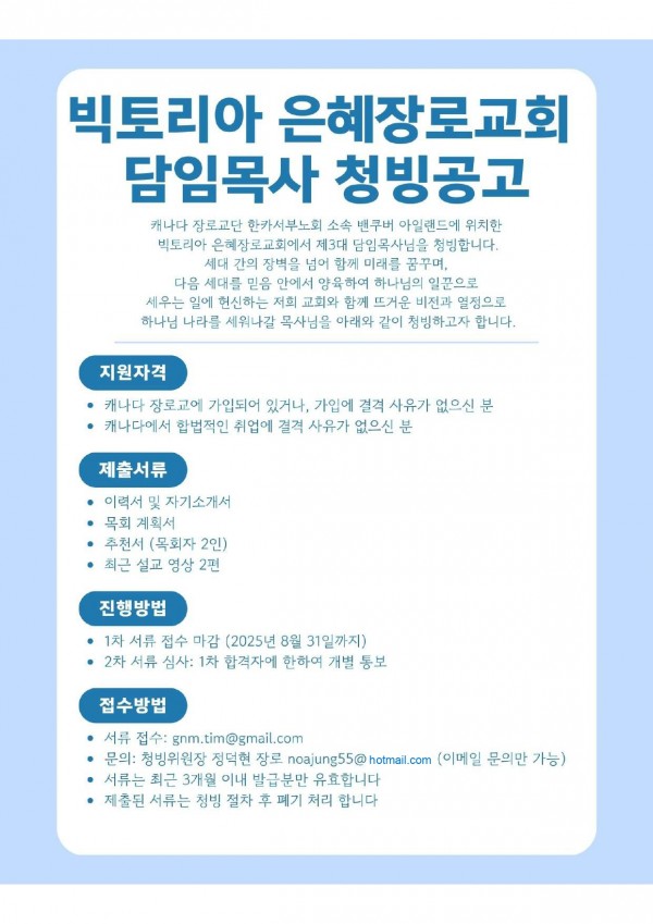 [목회자 청빙] 캐나다 비씨주 빅토리아 은혜장로교회에서 제3대 담임목회자를 청빙합니다. 페이지 정보 작성자 제니킴 쪽지보내기 자기소개 아이디로 검색 전체게시물 쪽지보내기 자기소개 아이디로 검색 전체게시물 | 작성일2025-08-06 | 조회조회수 : 13,349회 목록 본문 교회 주소: 675 Jolly Place, Victoria, BC Canada홈페이지: www.victoria.or.krYouTube: 빅토리아 은혜장로교회 이전글영아부 사역자 청빙(Part-time) 25.08.06 다음글시애틀우리교회(벨뷰) 목회자/사역자 청빙 25.08.05